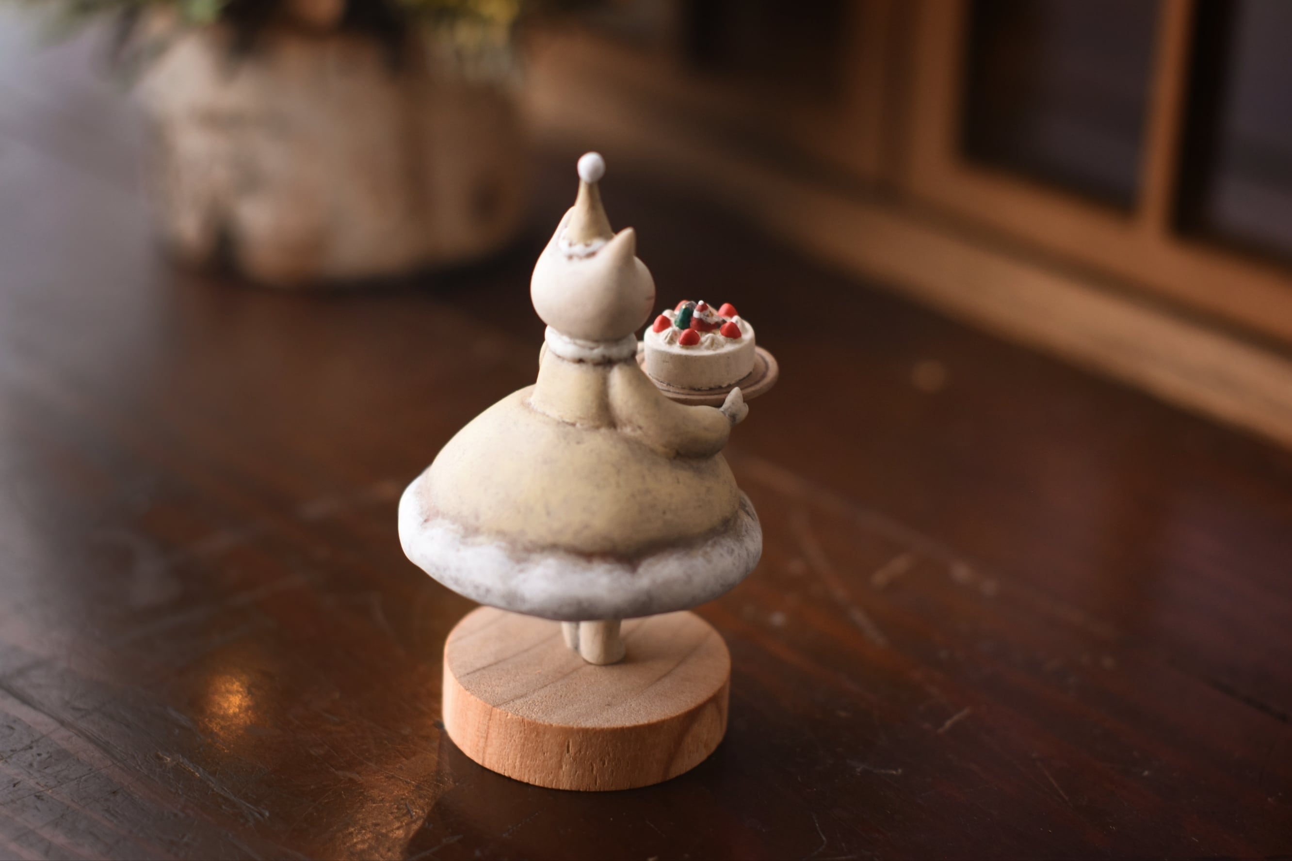 サンタの衣装をまとった可愛いネコが、レトロなケーキを抱えてあなたのもとにやってきます。