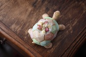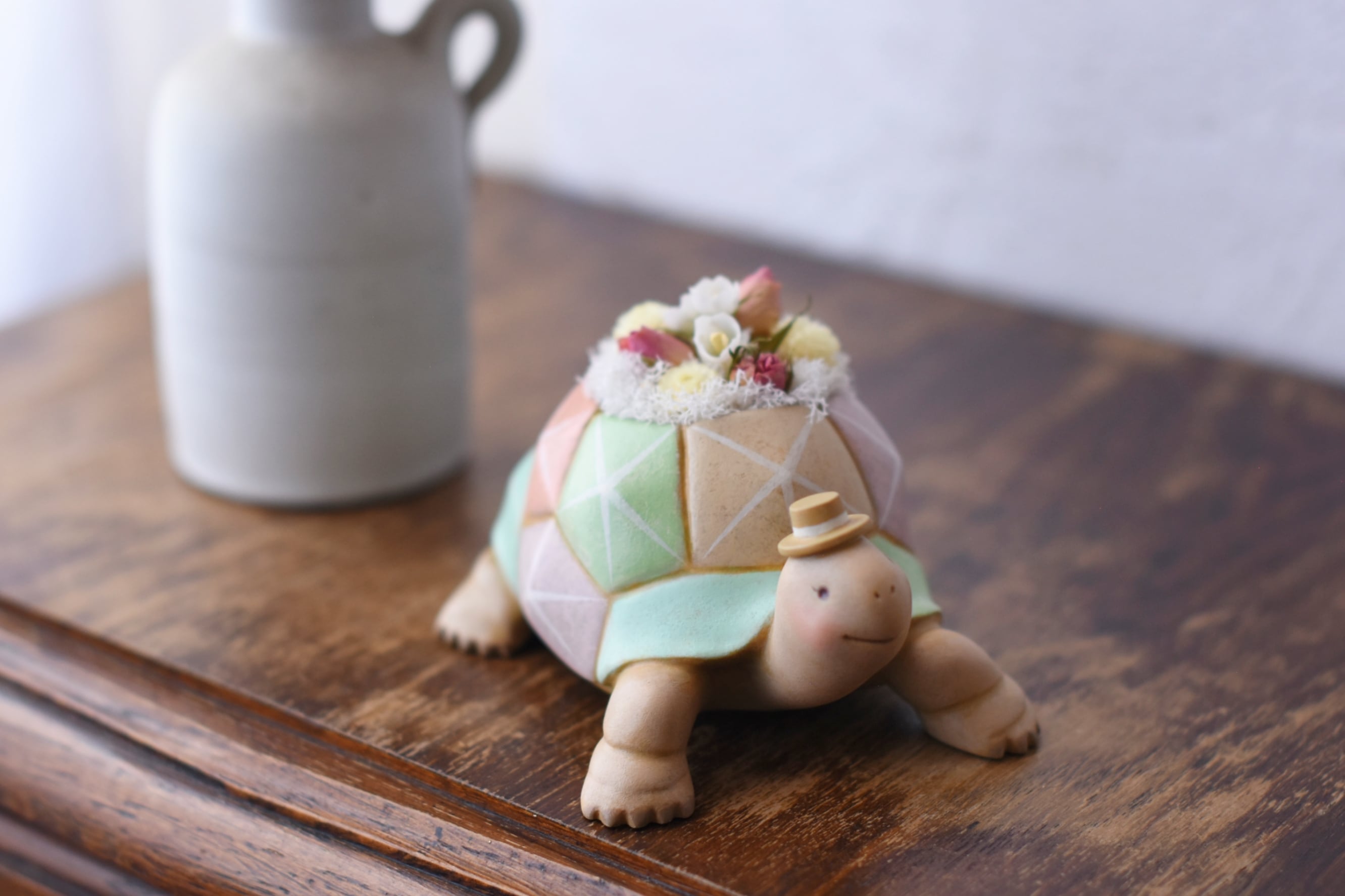 お花を背負ったおしゃれなカメさんです。帽子をかぶって少し得意気な表情をしています。