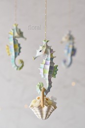 貝のカゴをぶら下げて、お買い物中のタツノオトシゴさんです。