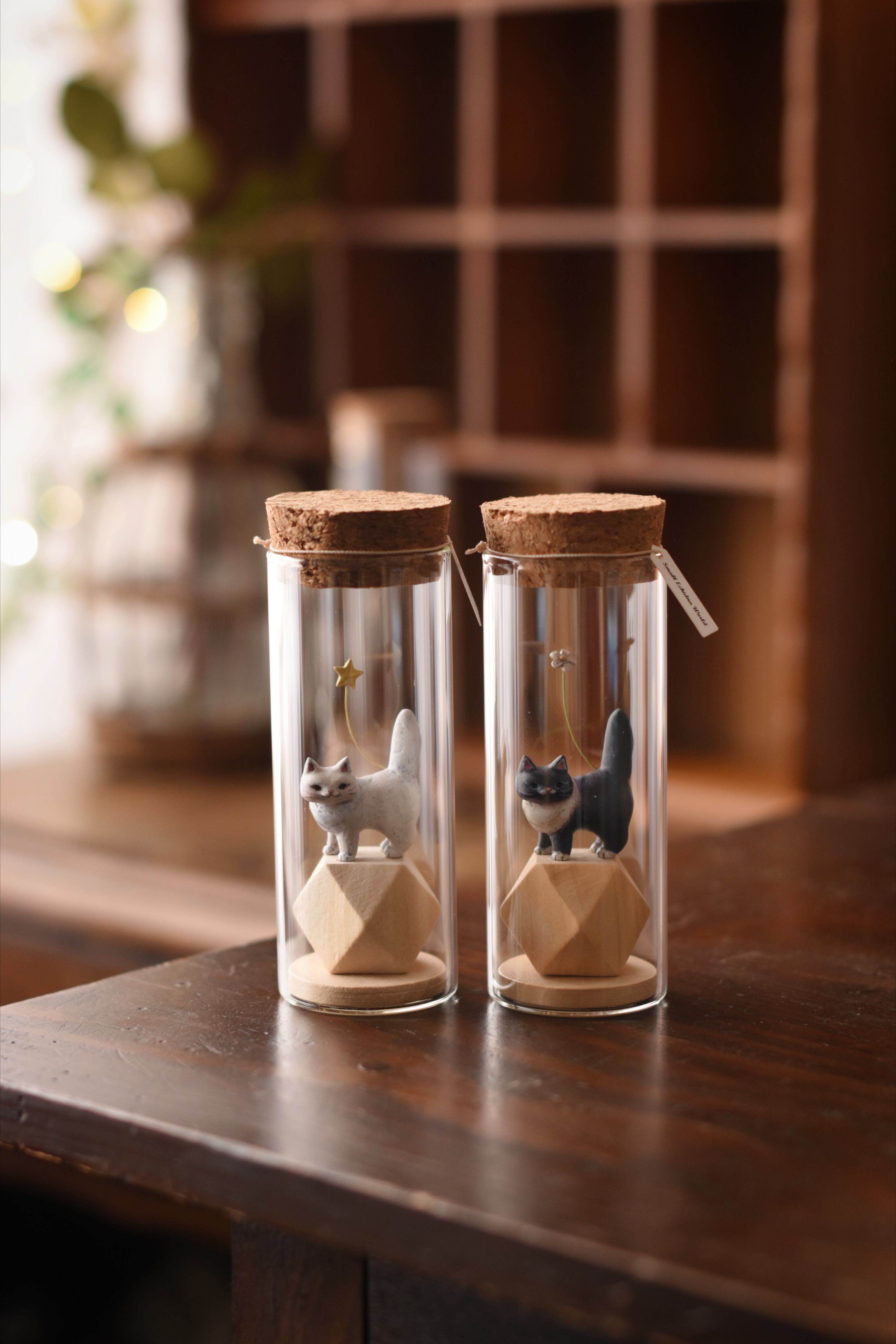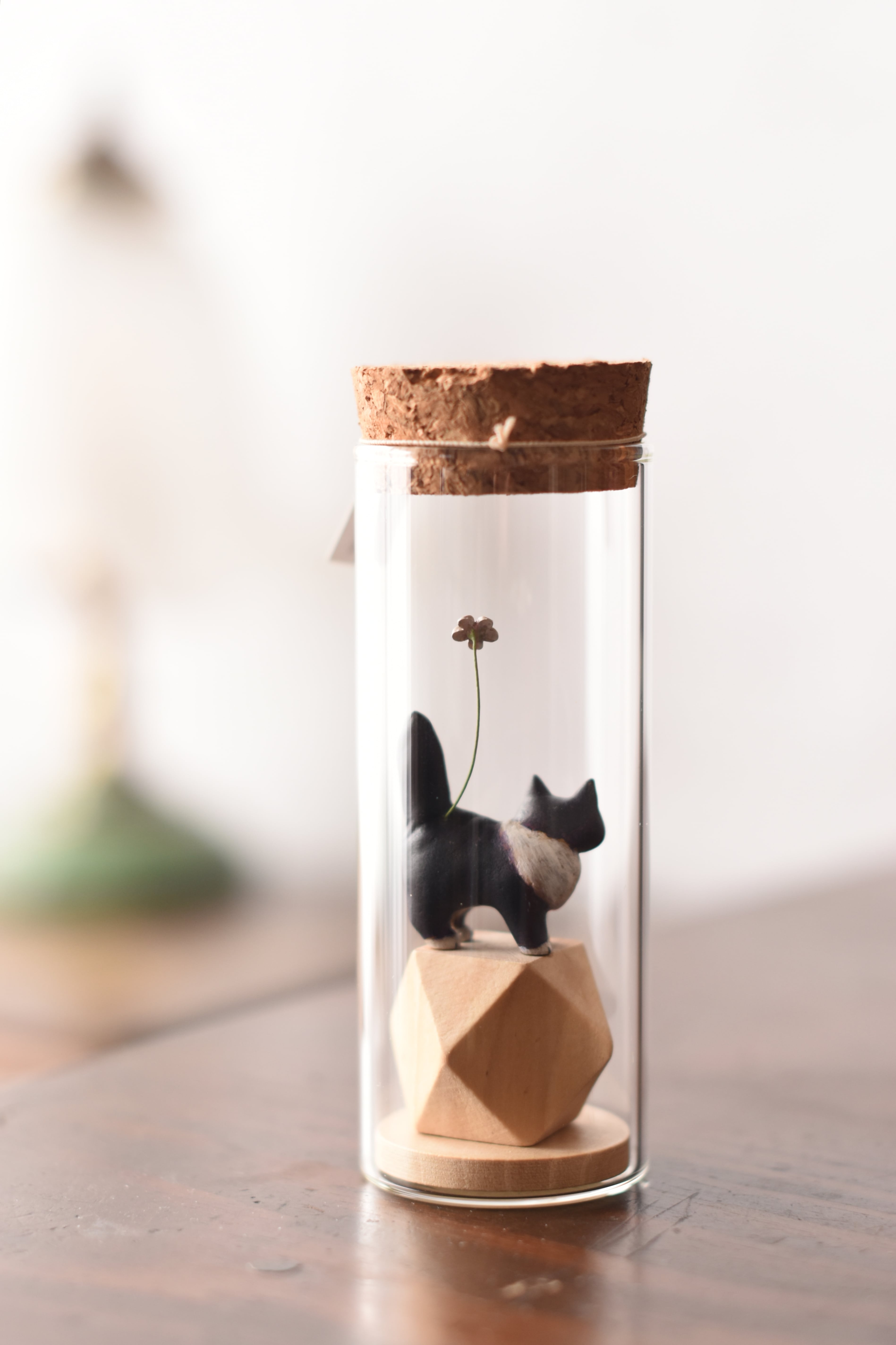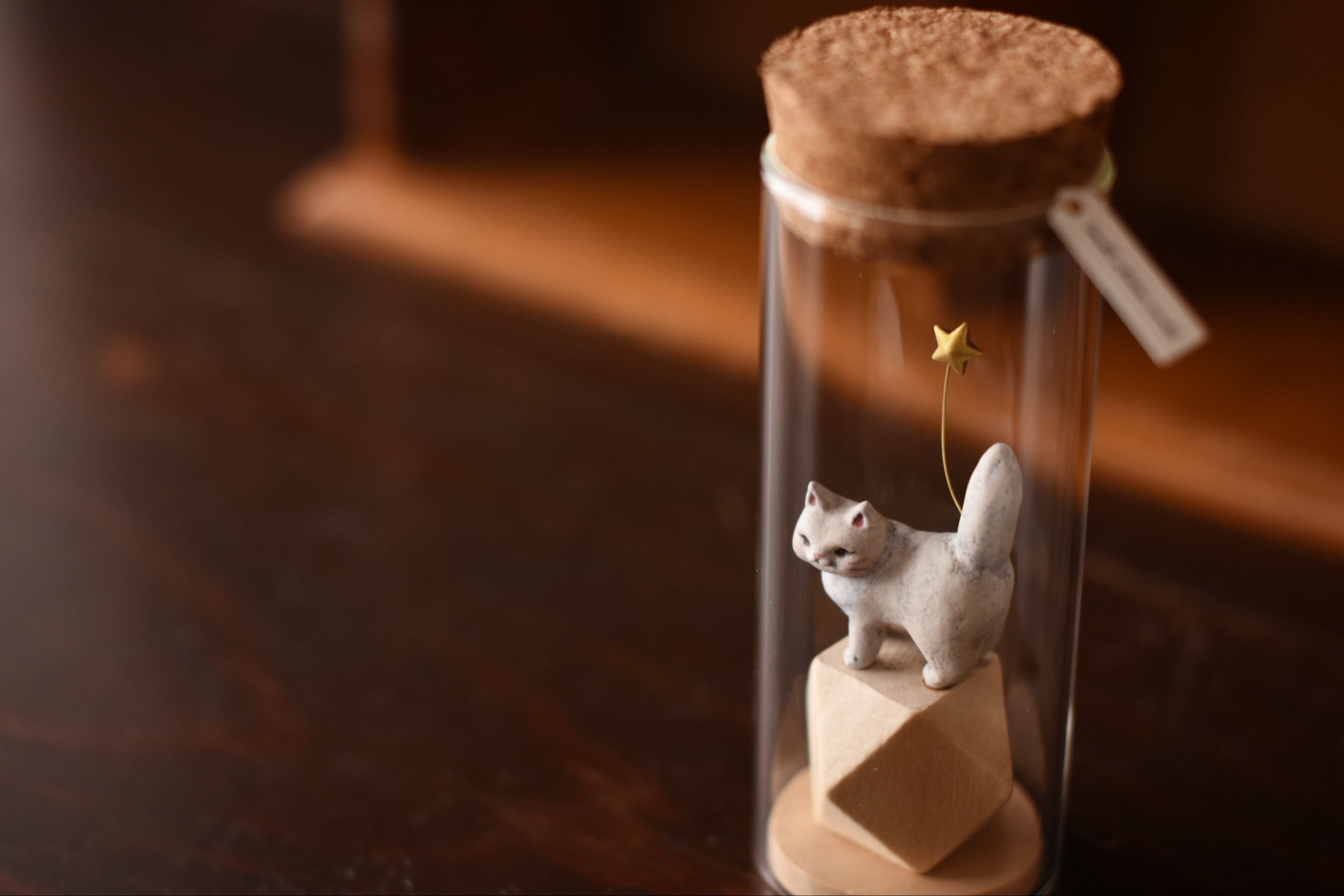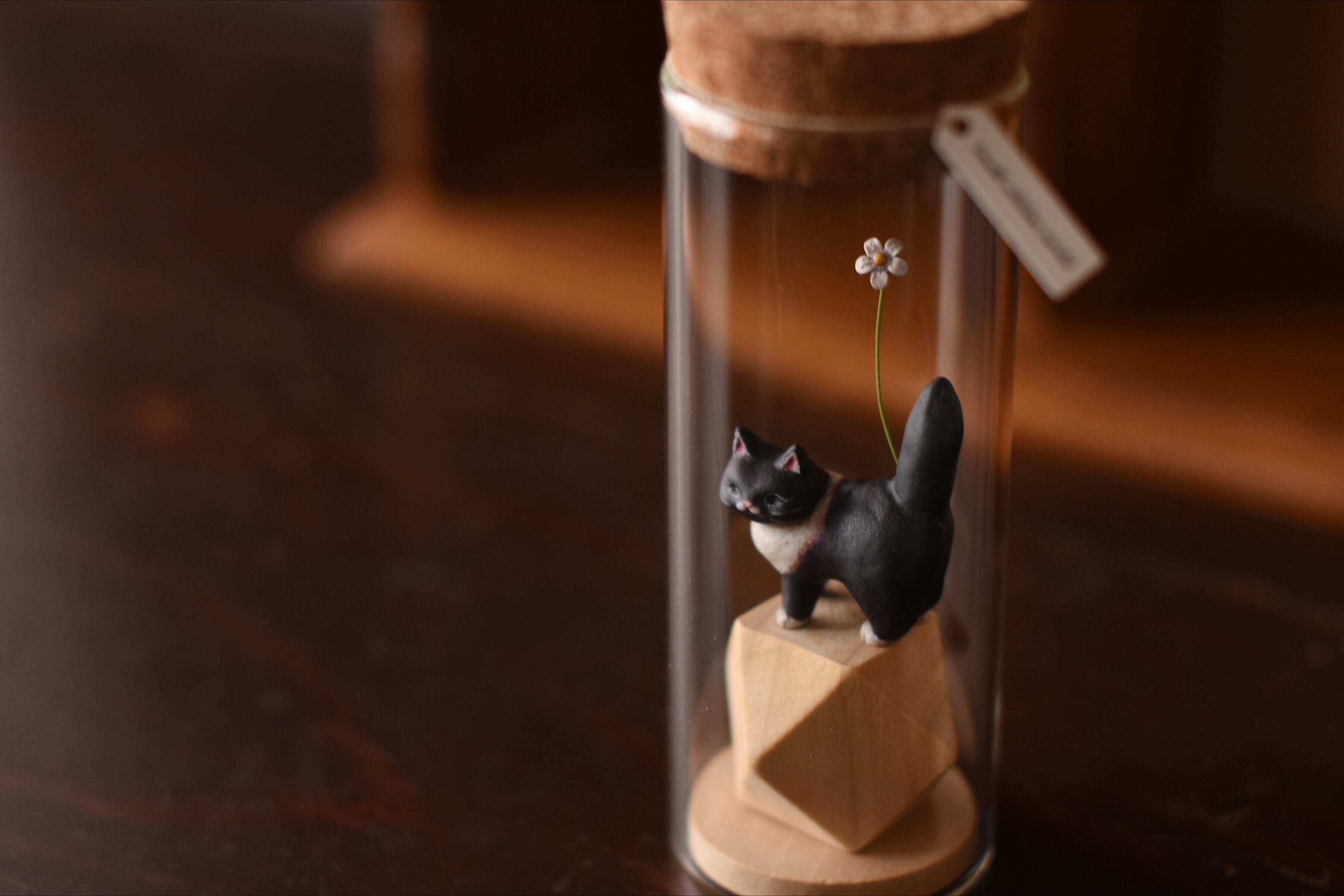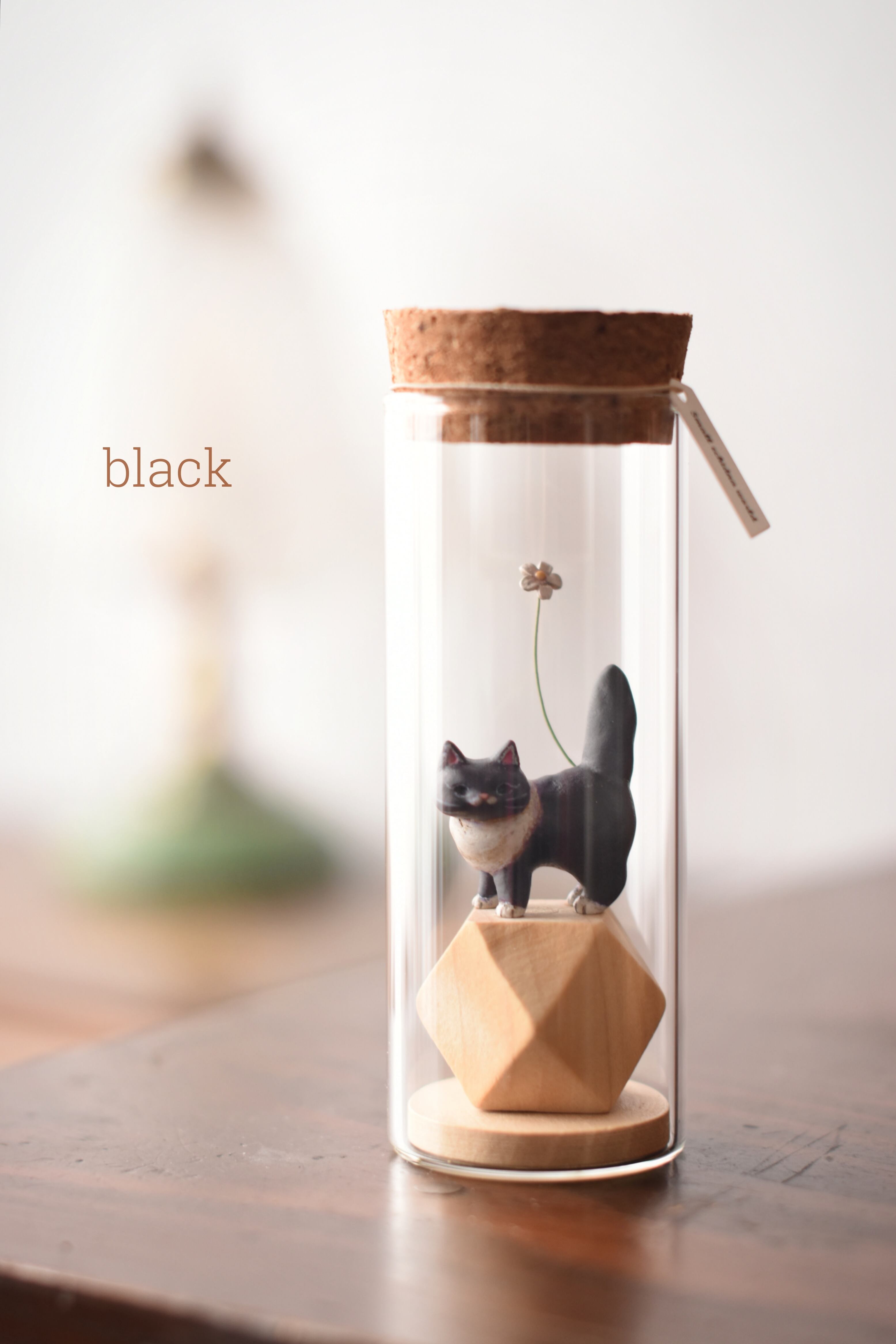 小さなにゃんこを小瓶に収めた作品です。