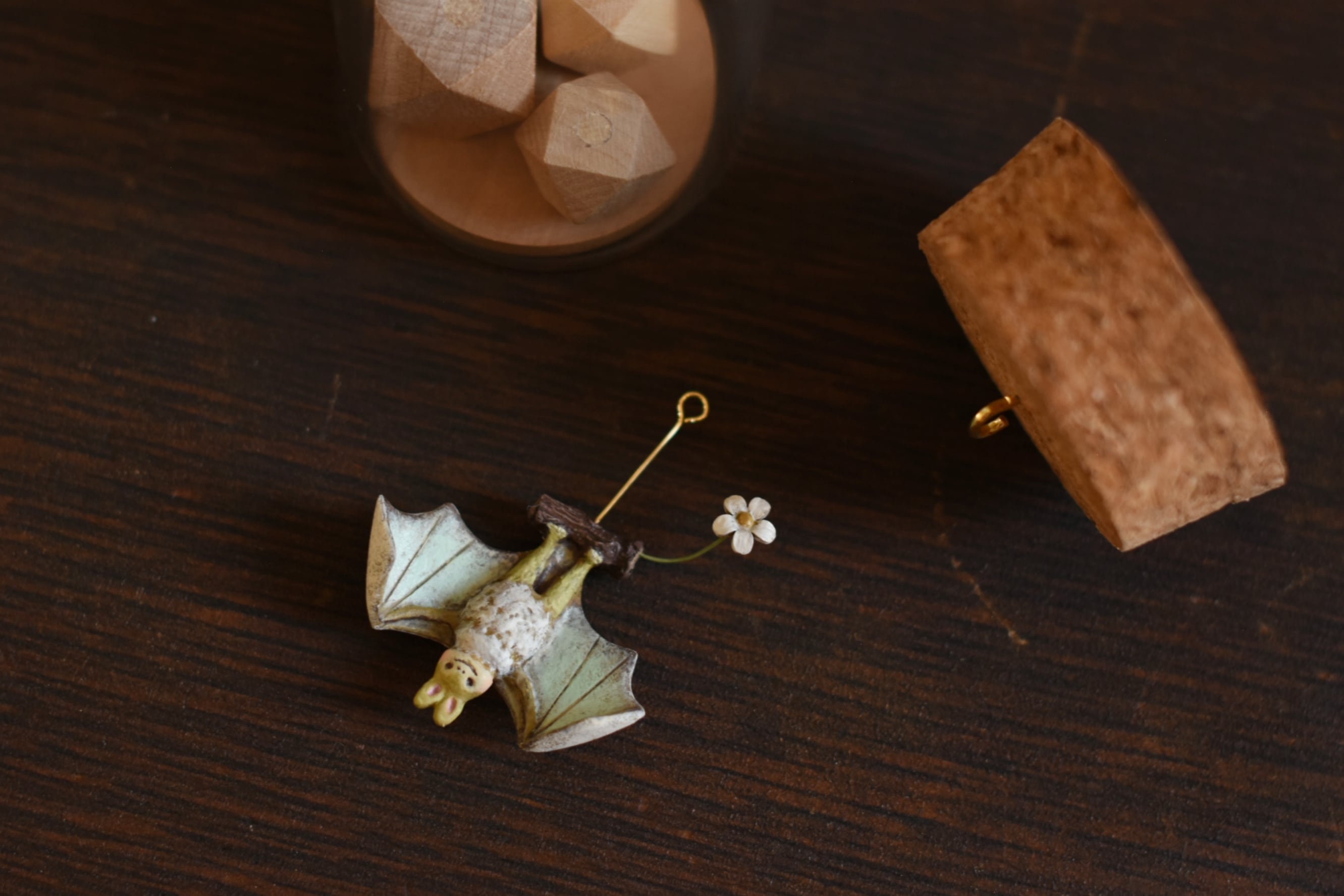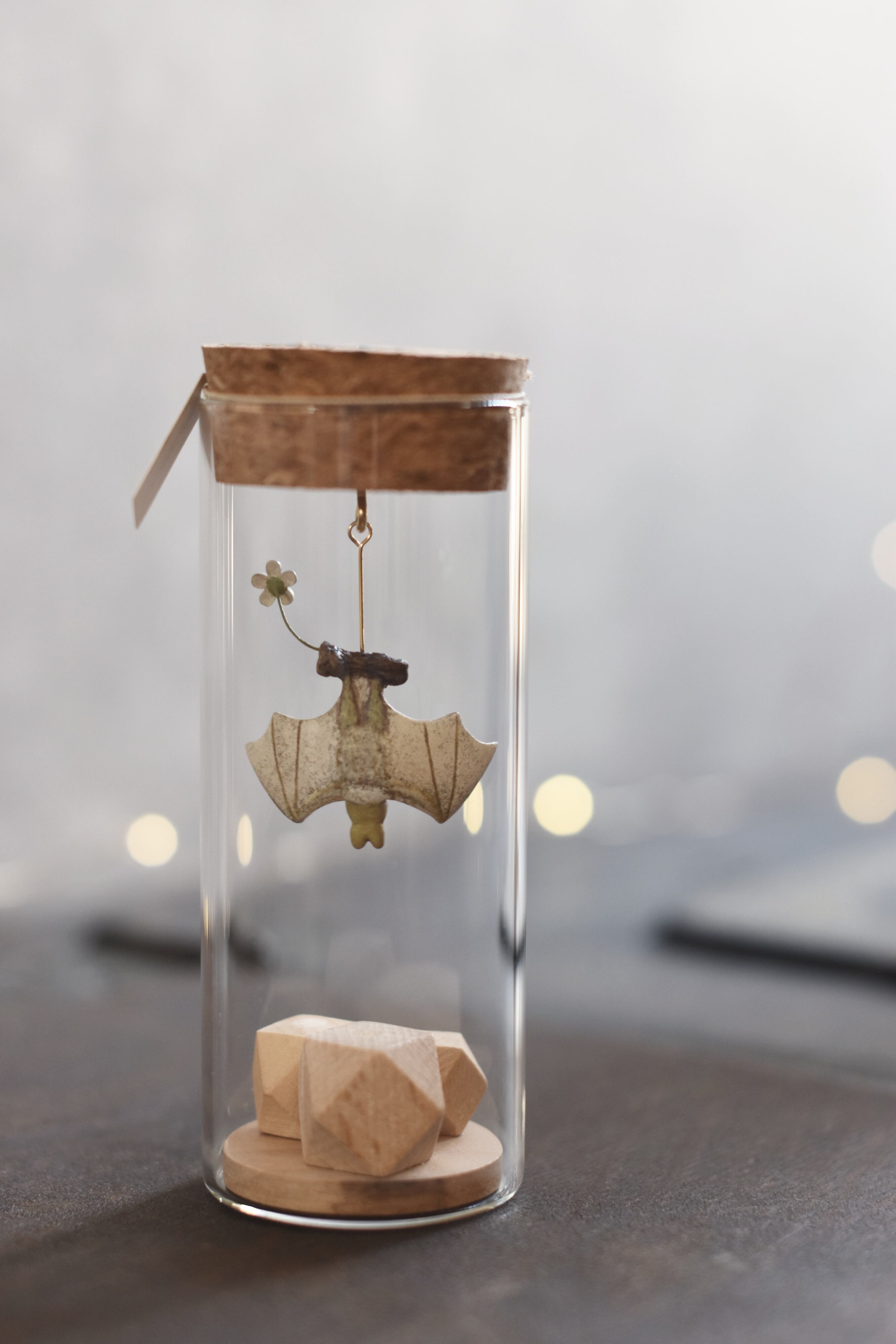 小さなコウモリを小瓶に収めた作品です。